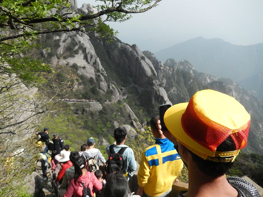 看過上圖,不知幾個人還能睡得好,雖然白天爬山太累??本人也本著之前去過一次黃山,認為黃山的風景還是很秀麗的,所以在今年5.1又帶家人去了一次,由于過節太擠了,索道太難等了,全家都是從云谷索道爬上去的,因為我去過一次,所以就由我帶領家人從以前走過的線路走的.本以為這次也帶家人看一看黃山在書中所寫的半山寺外抬頭見,展翅金雞叫道衢;登上龍蟠回首睹,扶肩五老上天都的風景,可惜月份去得太早了點,樹也才發芽,葉子都還沒有長出來,最難受的那就是人太多,一路是走走停停,不遠的路都要走比平時多幾倍的時間.