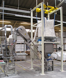 一種是大袋開袋站是靠叉車將大袋(噸袋)吊裝到卸料機(jī)的機(jī)架上,它本身不帶起重設(shè)備。